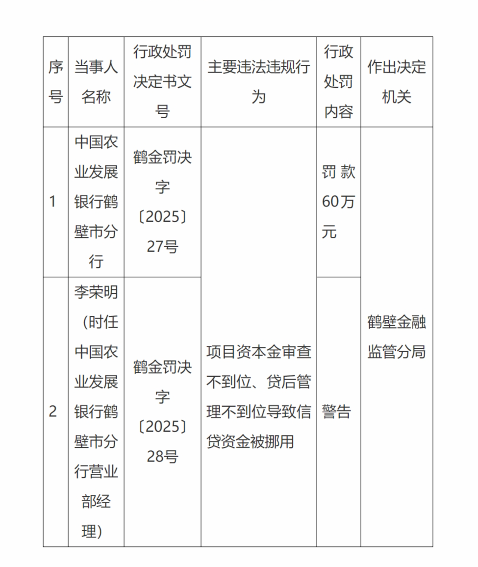 12月19日,国家金融监督管理总局鹤壁监管分局行政处罚信息公示表显示,中国农业发展银行鹤壁市分行,项目资本金审查不到位、贷后管理不到位导致信贷资金被挪用,被罚款60万元;李荣明(时任中国农业发展银行鹤壁市分行营业部经理),被警告。
