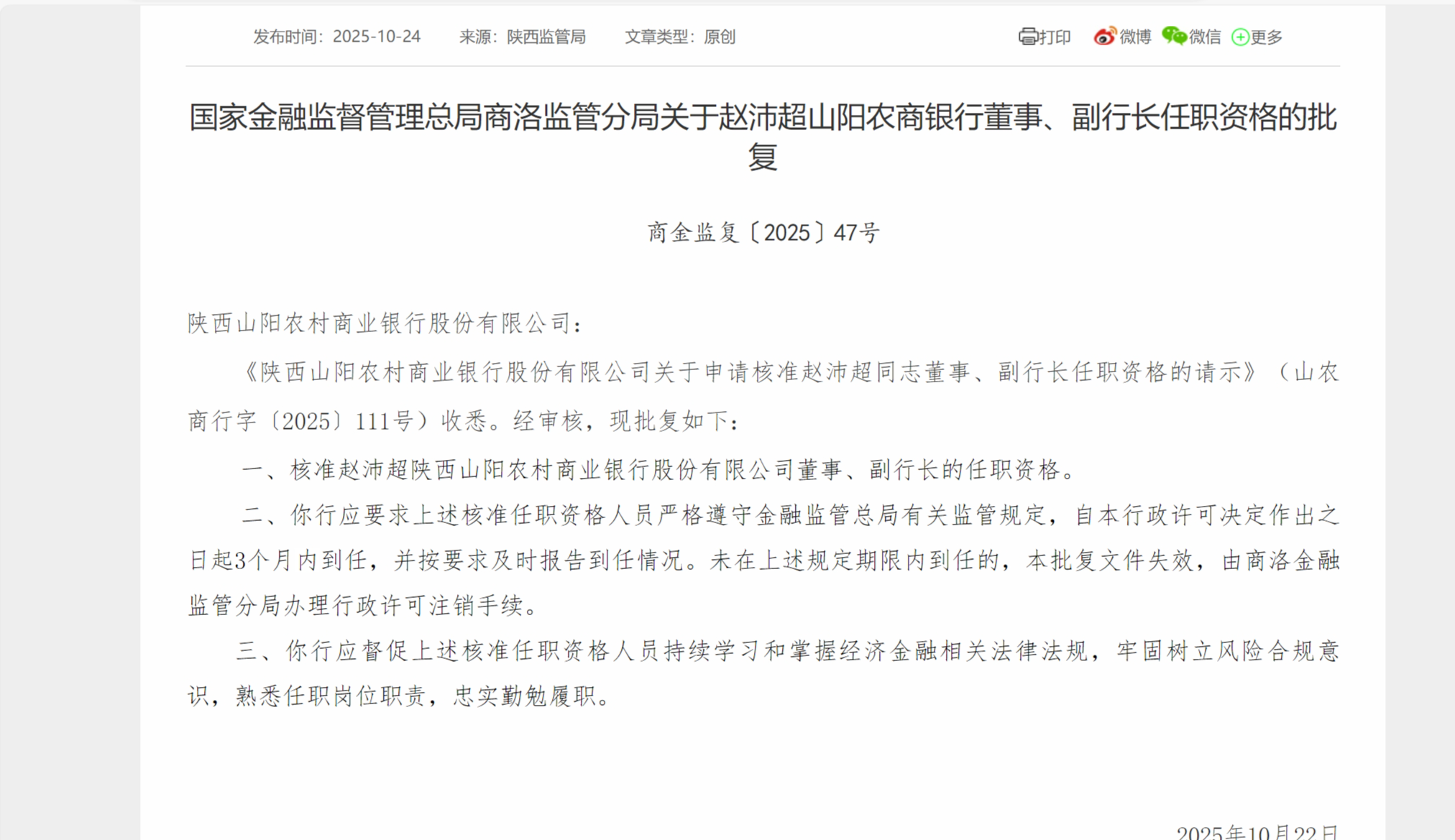 10月24日,国家金融监督管理总局商洛监管分局发布关于赵沛超山阳农商银行董事、副行长任职资格的批复,核准赵沛超陕西山阳农村商业银行股份有限公司董事、副行长的任职资格。