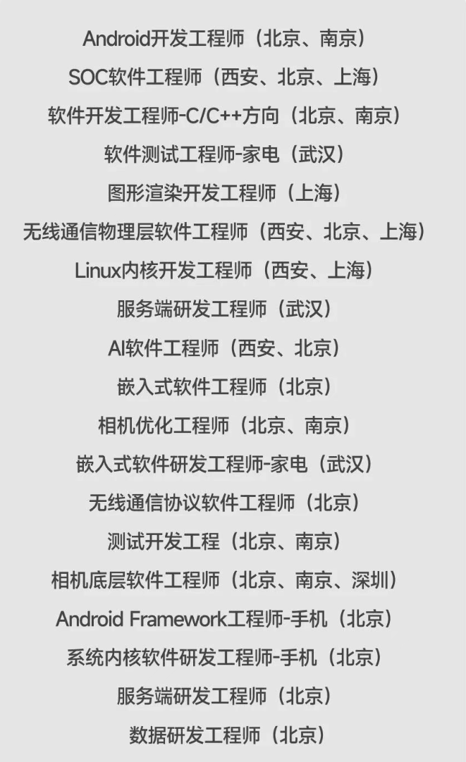 在小米官方近期发布的系列招聘公告中,招聘岗位种类繁多,涉及软硬件研发类、服务类等众多专业方向。部分招聘对象为2026届海内外应届毕业生,招聘职位包括Android开发工程师、SOC 软件工程师、软件测试工程师、图形渲染开发工程师等几十种类型,涉及计算机、软件、电子信息、通信工程、信息安全、电子科学与技术等专业。工作地点分布在北京、上海、南京、武汉、深圳等地。